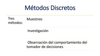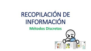 Este documento describe tres métodos discretos para la recopilación de información: muestreo, investigación y observación del comportamiento del tomador de decisiones. El muestreo involucra la selección sistemática de elementos representativos de una población para su análisis. La investigación implica el examen de datos cuantitativos y cualitativos como informes, registros y documentos para descubrir información no disponible a través de otros métodos. La observación del tomador de decisiones y su entorno físico permite al analista ver de primera mano cómo se rec