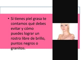 El documento proporciona consejos sobre cómo cuidar la piel grasa, destacando la identificación de sus características y la importancia de usar productos específicos que regulen la producción de sebo. Se recomienda evitar productos grasos y el contacto directo con el rostro, así como realizar cuidados diarios y mensuales para mantener una piel saludable. Además, se sugiere una limpieza profunda y la exfoliación regular para prevenir el acné y los puntos negros.