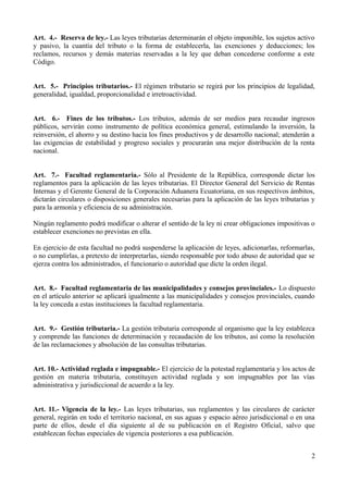 Este documento presenta una introducción y el Título I del Código Tributario ecuatoriano. La introducción explica las secciones que se han suprimido del código. El Título I contiene 14 artículos que establecen disposiciones fundamentales sobre la aplicación del código, la supremacía de las normas tributarias, el poder tributario, la reserva de ley, los principios tributarios, los fines de los tributos, la facultad reglamentaria y la interpretación de la ley tributaria.