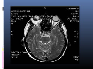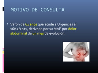 Este documento presenta el caso de un paciente de 61 años diagnosticado con melanoma metastásico. El paciente acudió a urgencias con dolor abdominal y pérdida de peso. Las pruebas mostraron metástasis hepáticas de un melanoma ocular derecho primario. El paciente fue dado de alta con cuidados paliativos y falleció pocas semanas después con empeoramiento de los síntomas.