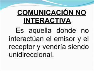 Este documento describe diferentes tipos de comunicación como la comunicación interactiva, no interactiva y reactiva. También define conceptos clave de internet y medios digitales como URL, TIC, periodismo digital, navegación, formatos digitales, multimedia, hipertexto e hipervínculo.