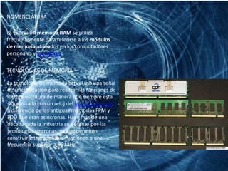 La memoria RAM es la memoria de acceso aleatorio desde donde el procesador recibe instrucciones y guarda resultados. Se utiliza como memoria de trabajo para el sistema operativo, programas y software, donde se cargan las instrucciones que ejecuta el procesador. Los módulos de memoria RAM contienen circuitos integrados DRAM en tarjetas de circuito impreso que se conectan al controlador de memoria a través de buses para direccionamiento, datos y señales de control.