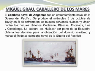 El documento describe el combate naval de Angamos durante la Guerra del Pacífico entre los buques peruanos Huáscar y Unión y los buques chilenos Cochrane, Blancas, Encalada, Loa y Covadonga el 8 de octubre de 1879. La captura del buque peruano Huáscar por parte de la escuadra chilena fue decisiva para que Chile obtuviera el dominio marítimo y marcó el fin de la campaña naval de la guerra.