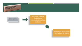 Este documento describe el objeto Connection en Java, que representa la conexión a una base de datos. Explica que Connection permite obtener una conexión a través de DriverManager y especificar la conexión a través de una cadena de conexión. También describe los métodos de Connection como BeginTrans, CommitTrans, RollbackTrans y Execute para realizar transacciones y ejecutar consultas SQL.