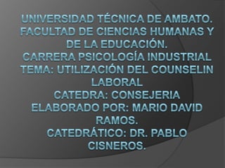 1) El documento habla sobre el counseling laboral y cómo el consejero guía al individuo para identificar los factores que causan conflictos laborales. 2) Entre los factores identificados se encuentran mala comunicación, mala relación con compañeros y factores económicos. 3) El documento también describe síntomas como peleas, bajo rendimiento y mala atención al cliente.