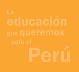 El documento presenta el Proyecto Educativo Nacional al 2021, el cual tiene como objetivo principal mejorar la calidad y equidad de la educación en el Perú hasta el año 2021. El proyecto propone seis objetivos estratégicos y sus correspondientes políticas y resultados para lograr una educación de calidad para todos los peruanos, con estudiantes e instituciones que logren aprendizajes pertinentes, maestros bien preparados, una gestión educativa descentralizada y democrática, una educación superior de calidad, y una sociedad comprometida con la educación.