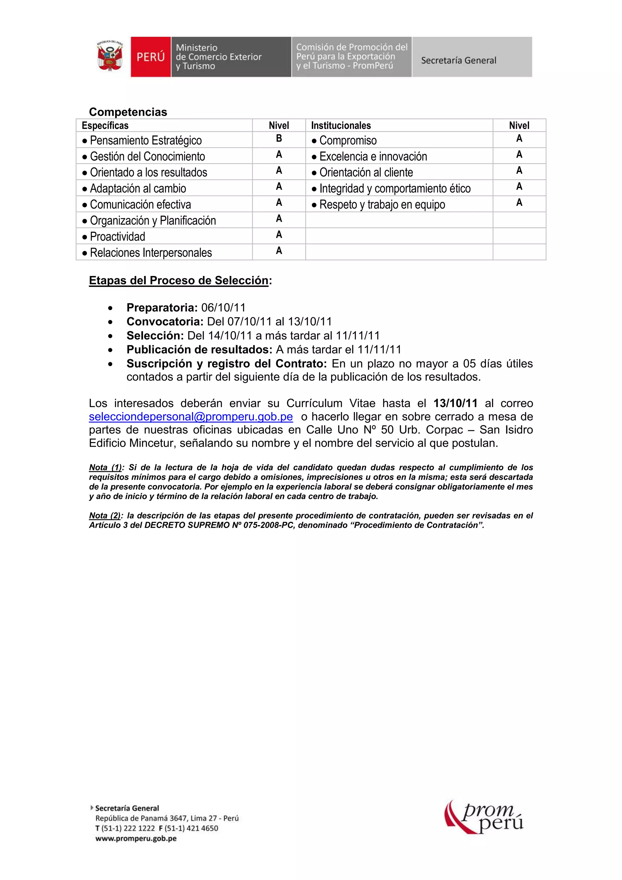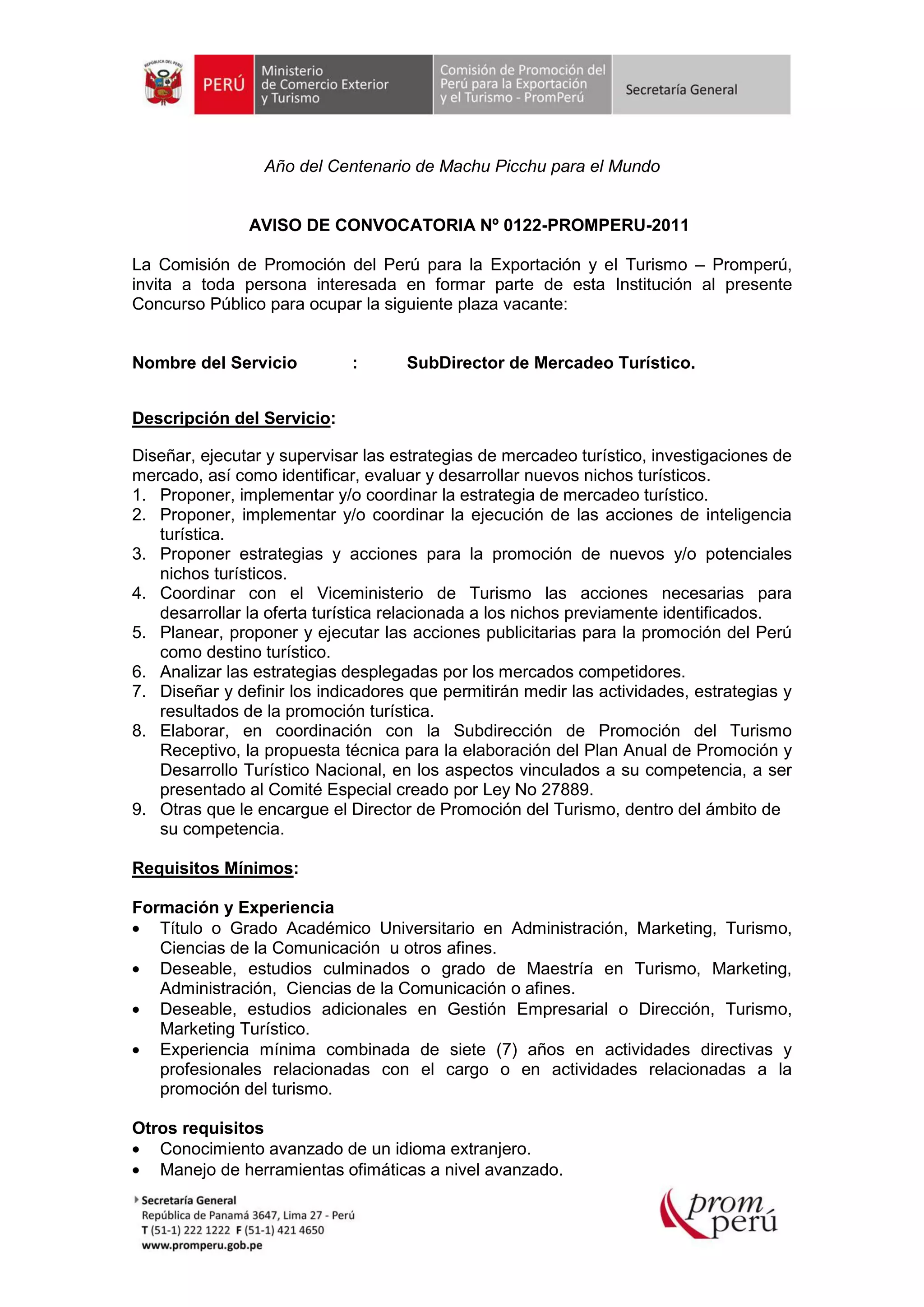 El documento anuncia una convocatoria para el puesto de Subdirector de Mercadeo Turístico en Promperú. El Subdirector diseñará y ejecutará las estrategias de mercadeo turístico y la identificación de nuevos nichos. Se requiere como mínimo 7 años de experiencia en promoción turística y un título universitario en áreas como administración, marketing o turismo. Los interesados deben enviar su currículum antes del 13 de octubre.