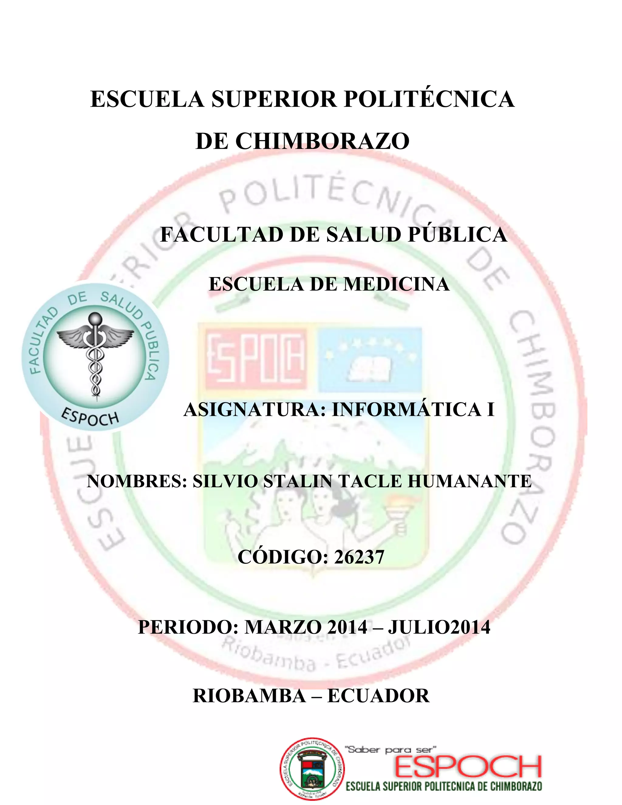Este documento proporciona información sobre un estudiante que cursa la asignatura Informática I en la Escuela de Medicina de la Facultad de Salud Pública de la Escuela Superior Politécnica de Chimborazo en Riobamba, Ecuador durante el período de marzo a julio de 2014. El estudiante se llama Silvio Stalin Tacle Humanante y su código es 26237.