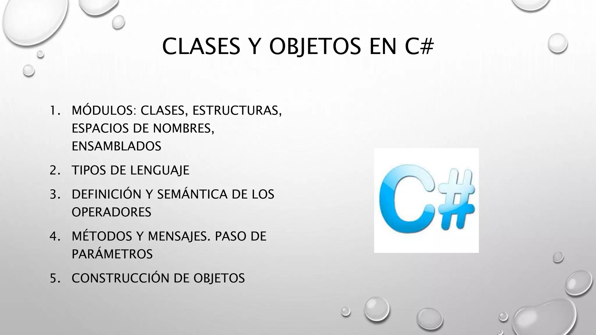 Este documento describe las clases y objetos en C#. Explica conceptos como clases, propiedades, visibilidad, espacios de nombres, ensamblados, tipos de lenguaje, construcción de objetos, enumerados, arrays, constructores y destructores.