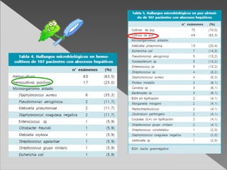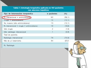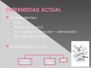 Este documento presenta un caso clínico de un paciente con absceso hepático. El paciente presentó dolor abdominal y fiebre. Exámenes revelaron elevación de leucocitos y proteína C reactiva. Un TAC mostró un absceso hepático. Tratamiento incluyó antibióticos y drenaje hepático. Exámenes posteriores encontraron Entamoeba histolytica. El paciente se recuperó con tratamiento amebicida.