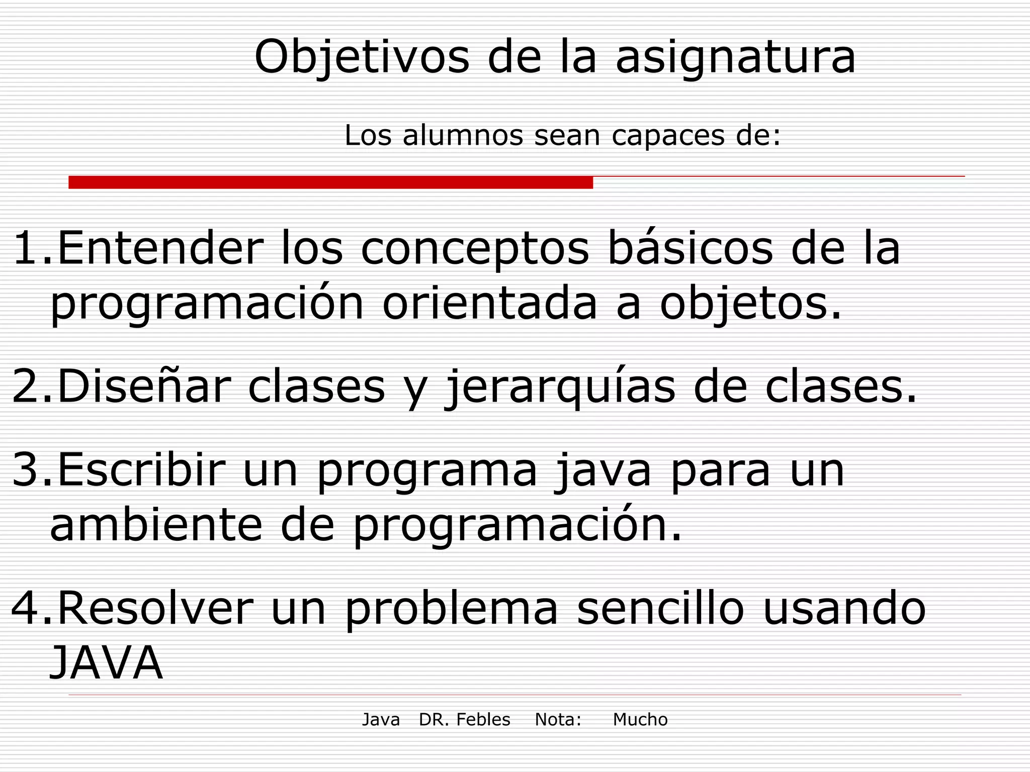 Este documento presenta una introducción al lenguaje de programación Java, cubriendo su historia, características principales como su naturaleza independiente de plataforma, orientación a objetos, seguridad y portabilidad, y herramientas disponibles. También describe brevemente los tipos comunes de programas en Java como applets, aplicaciones y servlets.