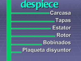 El documento describe las principales partes de un motor asincrónico monofásico. Estas partes incluyen la carcasa, las tapas, el estator, el rotor, las bobinas y la plaqueta disyuntor. El estator y el rotor están construidos con láminas de chapa de silicio. Las bobinas están alojadas en ranuras del estator y constan de dos campos, uno para el arranque y otro para el trabajo. La plaqueta disyuntor conecta y desconecta automáticamente la alimentación del campo de arranque.