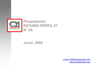 El documento presenta los resultados de una encuesta nacional realizada en 37 ciudades de Venezuela entre el 17 y 25 de junio de 2004. La encuesta incluyó 1,500 entrevistas y tuvo un margen de error de +/- 2.58%. Los resultados muestran las posturas políticas de los venezolanos, su percepción del entorno nacional, la gestión de gobierno y otros temas políticos del momento.
