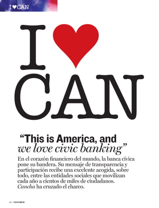 Este documento resume la expansión de la banca cívica de CAN a Estados Unidos a través de su equipo CanAmérica con sede en Washington D.C. Describe cómo Estados Unidos representa una gran oportunidad para la banca cívica debido a su gran economía y cultura filantrópica. CanAmérica está estableciendo alianzas con grandes organizaciones sin fines de lucro para promover la banca cívica y atraer clientes para CAN.
