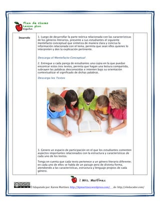 Este plan de clases propone enseñar a estudiantes de primaria los diferentes géneros literarios a través de 5 clases. Los objetivos son reconocer la clasificación de los géneros, sus características y autores representativos. Las actividades incluyen leer textos de diferentes géneros, identificar sus características, producir sus propios textos y evaluar ejemplos desconocidos. El plan utiliza lecturas, mentefactos y discusión para motivar a los estudiantes a apreciar y crear diferentes tipos de liter