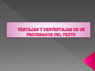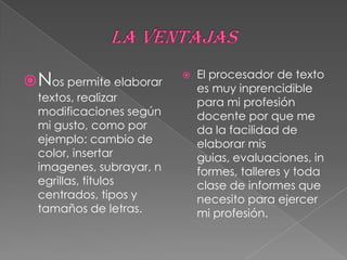 El procesador de texto permite elaborar documentos y realizar modificaciones fácilmente. Se aplica en escuelas, oficinas y otros lugares para crear informes, guías y evaluaciones. Ofrece herramientas como editar texto, insertar imágenes y tablas que facilitan la creación de documentos de manera versátil.