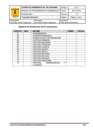 Este documento presenta el procedimiento para incendios vehiculares del Cuerpo de Bomberos de Talcahuano. Define términos clave como vehículos eléctricos, híbridos y convencionales. Describe las responsabilidades del comandante y capitanes y el procedimiento operacional, incluyendo la llegada segura a la escena, evaluación de peligros como baterías, tanques de combustible y bolsas de aire, y consideraciones ambientales.
