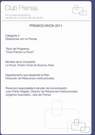 La Rural creó el Club Prensa, un programa de fidelización para periodistas que les ofrece beneficios como entradas gratis a ferias, 3 horas de estacionamiento gratis, almuerzos gratis y más. El objetivo es establecer una relación a largo plazo con periodistas influyentes para mejorar la imagen de la compañía. El programa involucra 130 periodistas seleccionados y usa tarjetas personalizadas, envíos por correo y eventos especiales para mantener a los periodistas informados de los beneficios.