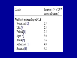 El documento describe el cáncer primario desconocido, que representa alrededor del 2-3% de los casos de cáncer. Aunque el sitio primario no se identifica inicialmente, en aproximadamente el 25% de los pacientes se hace evidente durante la enfermedad. Los estudios histopatológicos e inmunohistoquímicos son útiles para caracterizar el tipo de cáncer. Existen algunos subgrupos como cáncer de células germinales extragonadal y carcinomatosis peritoneal en mujeres que se benefician de un tratamiento dirigido.
