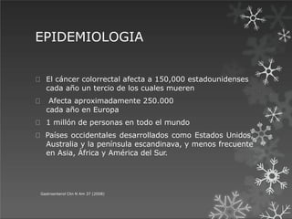 Este documento resume la epidemiología, factores de riesgo, tipos y clasificación de pólipos y cáncer colorrectal. El cáncer colorrectal afecta a millones de personas anualmente en todo el mundo y es la segunda causa de muerte por cáncer en países occidentales. Los factores de riesgo incluyen dieta, edad, enfermedades inflamatorias intestinales, diabetes, tabaquismo y antecedentes familiares. Existen varios síndromes hereditarios asociados como la poliposis adenomatosa familiar. Los pólip
