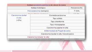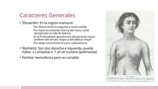 El documento aborda la anatomía de la mama, su estructura, características generales y el cáncer de mama, incluyendo su epidemiología, factores de riesgo, métodos de diagnóstico y tratamientos disponibles. También se detalla la autoexploración mamaria y las recomendaciones para su detección temprana, además de la clasificación de las lesiones mamarias según el sistema BI-RADS. Finalmente, se mencionan los tipos de carcinoma ductal y lobulillar, así como la importancia de la biopsia del ganglio centinela y las opciones de terapia adyuvante para el manejo del cáncer de mama.