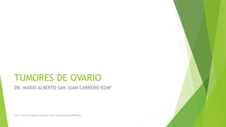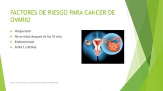 Este documento describe diferentes tipos de tumores de ovario, incluyendo factores de riesgo, síntomas, diagnóstico e información sobre tumores epiteliales, germinales y estromales. Los tumores epiteliales son los más comunes y se diagnostican en etapas avanzadas, mientras que los tumores germinales se detectan con más frecuencia en etapas tempranas. El documento proporciona detalles sobre las características y tratamiento de diferentes tipos de tumores.