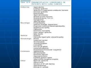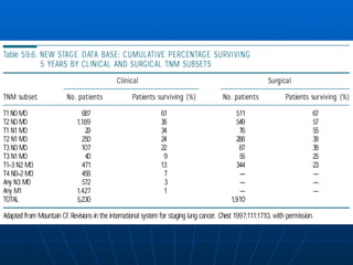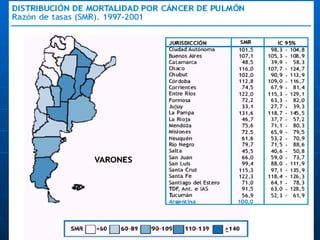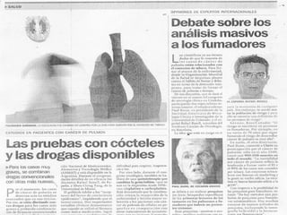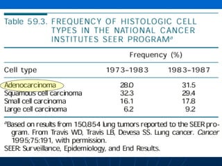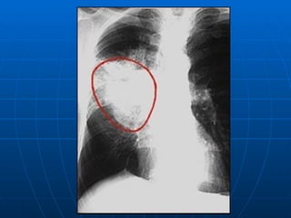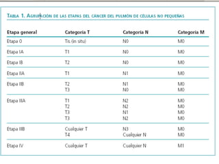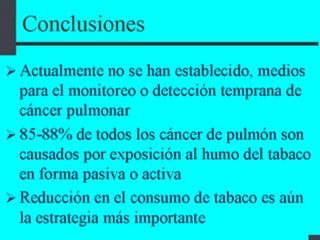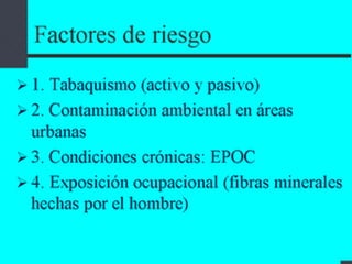 Este documento trata sobre conceptos básicos del cáncer de pulmón. Explica que el cáncer de pulmón se produce por un crecimiento anormal e incontrolado de las células pulmonares, y que el principal factor de riesgo es fumar tabaco. Describe los dos principales tipos de cáncer de pulmón, de células pequeñas y de células no pequeñas, y sus características. Finalmente, analiza las causas y factores de riesgo asociados al desarrollo de cáncer de pulmón.