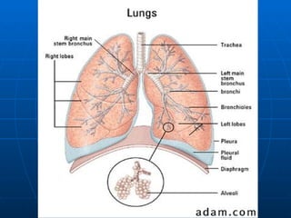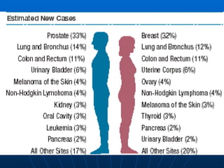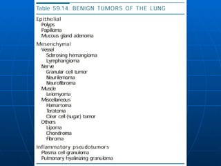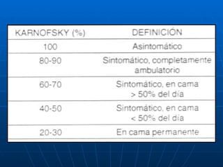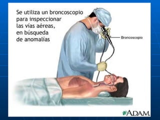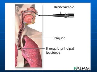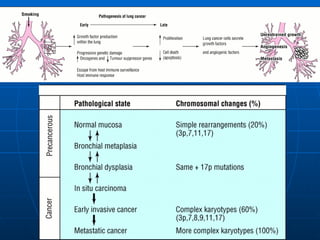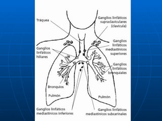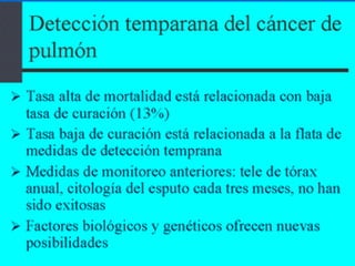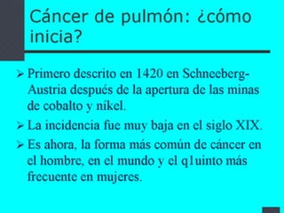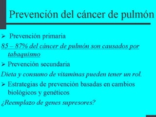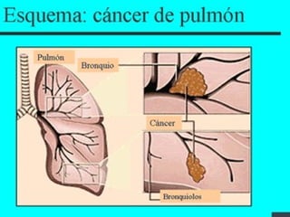 El documento proporciona información sobre el cáncer de pulmón, incluyendo sus causas principales, tipos y síntomas. La principal causa es fumar, que causa aproximadamente el 90% de los casos en hombres y el 70% en mujeres. Existen dos tipos principales: cáncer de células no pequeñas (80% de los casos) y cáncer de células pequeñas (20% de los casos). Los síntomas más comunes son tos, dolor en el pecho y falta de aliento.