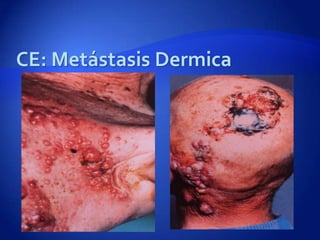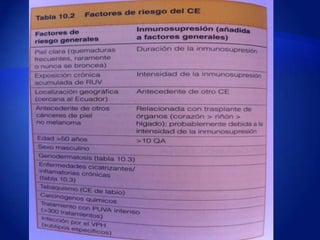 Este documento presenta información sobre el carcinoma epidermoide cutáneo (CE), incluyendo: sus causas, factores de riesgo, síntomas, tipos, tratamientos disponibles y su relación con la exposición a rayos UV. El CE es el cáncer de piel no melanoma más común y su incidencia ha aumentado en las últimas décadas. Los tratamientos incluyen quimioterapia tópica, crioterapia, cirugía y radioterapia. La prevención se centra en la protección solar y exámenes cutá
