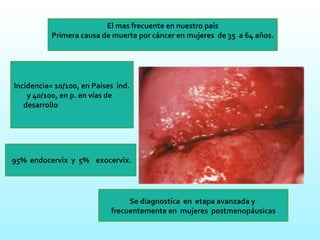 El documento proporciona información sobre el cáncer cervical. Explica que es la primera causa de muerte por cáncer en mujeres de 35 a 64 años y que se diagnostica frecuentemente en etapas avanzadas. Describe la fisiopatología del cuello uterino normal y anormal, factores de riesgo como la infección por VPH, síntomas, diagnóstico mediante pruebas como Papanicolaou e IVA/IVL, y tratamientos que incluyen conización, radioterapia y cirugía como histerectomía