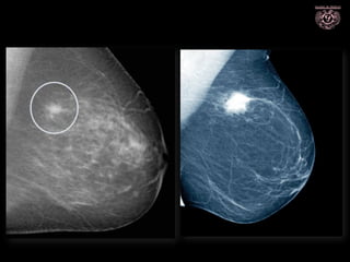 Este documento describe el cáncer de mama en el primer nivel de atención. Explica que el cáncer de mama es la neoplasia maligna no cutánea más común en mujeres y describe los factores de riesgo como la edad, antecedentes familiares, obesidad y uso de terapia hormonal. También cubre la detección a través de autoexploración, mamografía y ultrasonido, así como la derivación a especialistas cuando se sospecha malignidad.