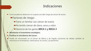 El antígeno carbohidrato 125 (CA 125) es una glicoproteína producida por el útero, cuello del útero y trompas de Falopio. Puede ser sintetizado tanto por células normales como malignas y no es un marcador específico de cáncer. Se usa para detección de cáncer de ovario en mujeres de alto riesgo y para monitorear el tratamiento oncológico. Los niveles normales son menores a 35 U/mL pero valores mayores a 65 U/mL tienen alta precisión para detectar c