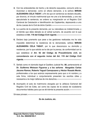 El señor Segundo Ramiro Caba Tomarema presenta una demanda de divorcio por la causal de falta de armonía en la vida matrimonial contra su cónyuge Mirian Alexandra Cela Taday. Segundo y Mirian se casaron en 2010 pero poco después Mirian comenzó a insultarlo y abandonó el hogar sin dejar saber su paradero. Segundo solicita que se declare disuelto el vínculo matrimonial y se ordene la marginación del acta de matrimonio en el Registro Civil.