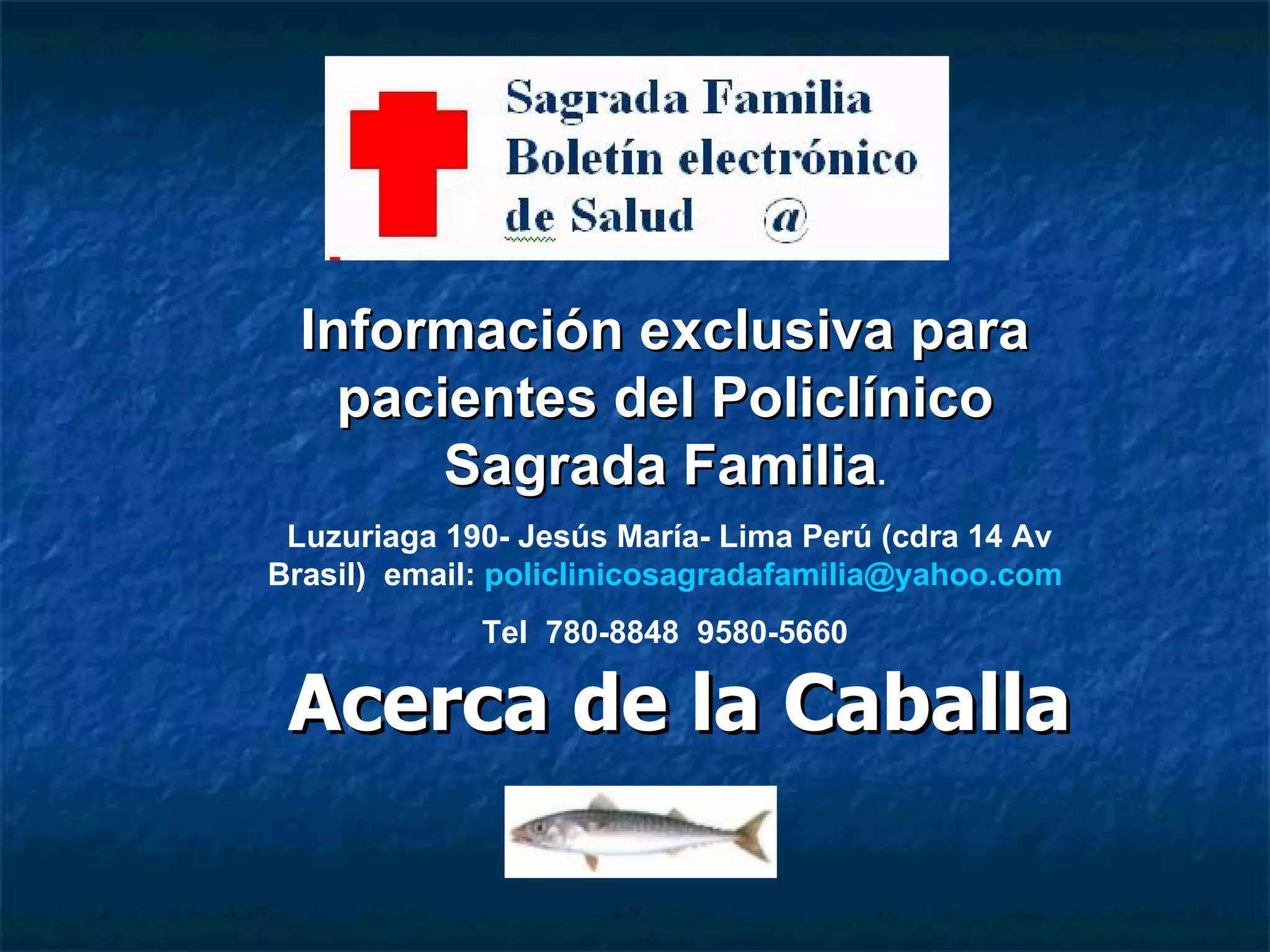 El documento habla sobre los beneficios del consumo de pescado, especialmente de la caballa, para prevenir la hipertensión arterial. Comer pescado regularmente, como dos o tres veces por semana, ayuda a reducir los triglicéridos, el riesgo de enfermedades cardíacas y accidentes cerebrovasculares debido a su contenido de ácidos grasos Omega-3. La caballa es una buena opción porque contiene altos niveles de Omega-3 y se puede encontrar fácilmente en el mercado.