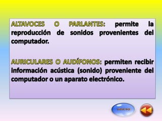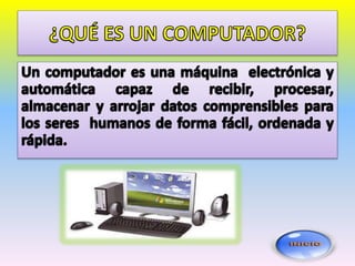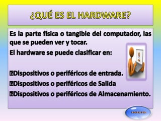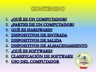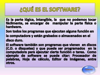 El documento describe los dos tipos principales de software: el sistema operativo, que administra los recursos físicos de la computadora e interactúa entre el usuario y el hardware, y las aplicaciones, que ayudan a tareas específicas como edición de textos e imágenes y cálculos.