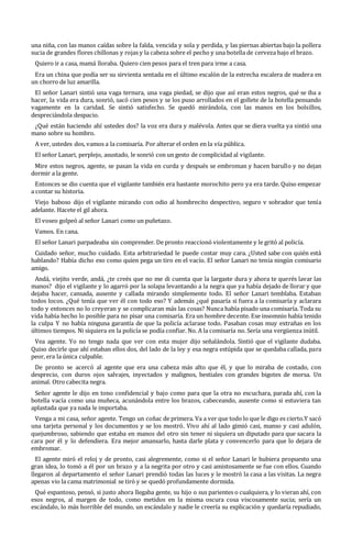 Este documento narra la historia de un hombre llamado el señor Lanari que sufre de insomnio una noche. Mientras fuma en el balcón de su departamento, escucha los gritos de una mujer en la niebla. Al investigar, encuentra a una mujer joven borracha en la puerta de un hotel. Le da dinero para que vaya a su casa, pero son detenidos por un policía que los lleva a la comisaría. El señor Lanari intenta sobornar al policía para evitar problemas, llevándolos a su departamento. La mujer jo