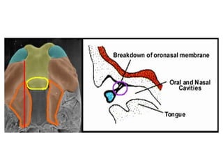 El documento describe el desarrollo de la cabeza y el cuello. Las células de la cresta neural migran para formar el mesenquima de esta región y dar origen a los músculos. Los arcos faringeos primitivos dan origen a diversas estructuras a través de sus derivados óseos, cartilaginosos, vasculares y nerviosos. Las bolsas faringeas forman parte de las amígdalas, timo y glándulas paratiroides. Problemas en el desarrollo de estas estructuras pueden causar sínd