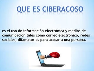 El documento describe el ciberacoso como el uso de medios electrónicos como correo electrónico y redes sociales para acosar y difamar a una persona. Explica que los ciberacosadores a menudo difunden información falsa sobre las víctimas, manipulan a otros para que también acusen a la víctima, y tratan de implicar a terceros en el acoso hasta que la víctima se suicida. Además, identifica diferentes tipos de ciberacosadores y sugiere campañas para crear conciencia sobre este problema.
