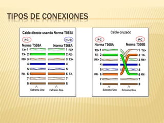 El documento describe las normas EIA/TIA-568A y B para cables de red y tipos de conexiones, incluyendo conexiones entre conmutadores y concentradores que pueden usar normas AA o BB, y conexiones PC a PC que pueden usar un cable cruzado sin la necesidad de un hub.