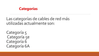 Este documento describe los diferentes tipos de cables Ethernet categorizados por su velocidad y capacidad, incluidas las categorías 5, 5e, 6 y 6A. Explica las dos posibilidades para conectar los cables RJ45 (T568A y T568B) y cómo usar distribuciones diferentes (T568A en un extremo y T568B en el otro) para crear un cable cruzado para Fast Ethernet. También cubre los materiales necesarios para crear cables Ethernet directos y cruzados.