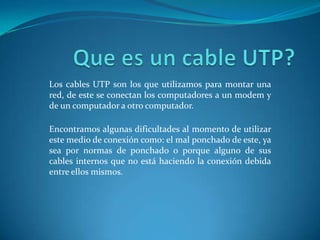Este documento describe el proceso para realizar un ponchado correcto de un cable UTP para una red. Explica que los cables UTP se usan para conectar computadores a un modem o entre sí en una red. Luego detalla los materiales necesarios como rosetas, ponchador y cable, y el orden correcto de los colores de los cables internos. Finalmente, resume el proceso de corte, pelado y ordenado de los cables, el ponchado en las rosetas y la verificación de que la conexión funciona correctamente. También distingue entre cables UTP categoría