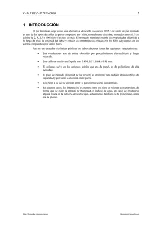 El documento describe los diferentes tipos de cables de par trenzado. Explica que un cable de par trenzado está compuesto de hilos de cobre trenzados entre sí y que el trenzado mantiene estables las propiedades eléctricas a lo largo del cable. Luego describe los diferentes tipos de cables, incluyendo cables de par trenzado apantallados, con pantalla global y no apantallados, así como las diferentes categorías de cables UTP. Finalmente, explica cómo instalar un cableado de par trenzado para una red, incluyendo el uso de conectores,