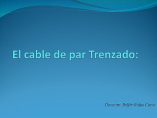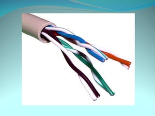 El cable de par trenzado es un tipo de cable que entrelaza conductores para reducir interferencias. Se usa comúnmente en redes Ethernet debido a su bajo costo y facilidad de instalación. Existen diferentes categorías de cable UTP que varían en su ancho de banda y velocidad de transmisión soportada. Los cables se conectan mediante conectores RJ-45 y pueden ser rectos o cruzados dependiendo de los dispositivos a conectar.