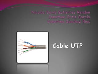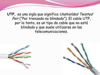 El documento describe los diferentes tipos de cable UTP, incluyendo las categorías más comunes del 1 al 7. Cada categoría tiene un ancho de banda y velocidad de transmisión de datos diferente, siendo la categoría 5 capaz de soportar hasta 100 Mbps. El cable UTP se utiliza comúnmente en redes de área local debido a su bajo costo y facilidad de uso.