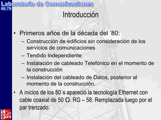 El documento describe los conceptos básicos del cableado estructurado para edificios. Explica que el cableado estructurado permite interconectar equipos de diferentes tecnologías para integrar servicios como datos, telefonía y control. También describe los componentes clave como el cableado horizontal, vertical y de campus, así como las normas y categorías de cableado.