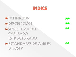 El documento describe los componentes clave de un sistema de cableado estructurado, incluyendo el cableado horizontal y vertical, los cuartos de telecomunicaciones y equipo, y los estándares de cables UTP/STP. Explica que el cableado estructurado distribuye cables dentro de un edificio para implementar una red de área local y debe seguir las limitaciones del diseño de red como la longitud máxima de segmento.