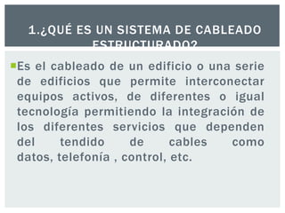 El documento resume los conceptos básicos de un cableado estructurado. Explica que es un sistema de cableado estructurado, cual es su objetivo principal y quienes establecen los estándares para este tipo de cableado. Además, menciona algunos de los organismos y normas más importantes que rigen este tema.
