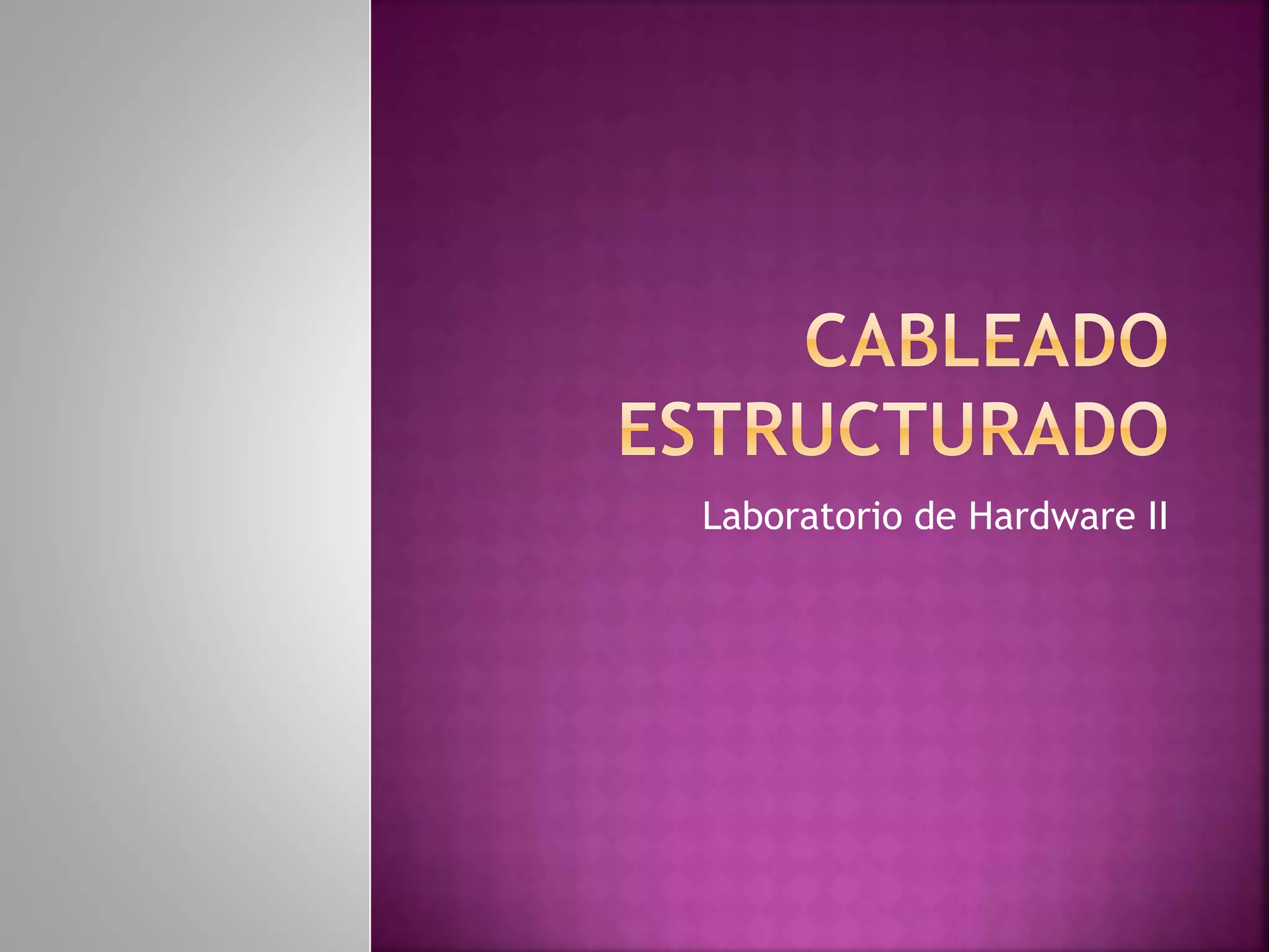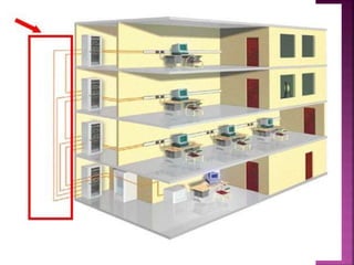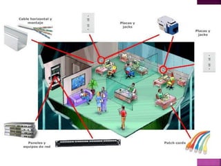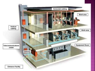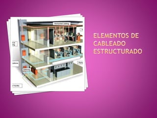 El documento habla sobre el cableado estructurado en edificios. Explica que el cableado estructurado permite interconectar equipos dentro de un edificio o entre varios edificios usando cables para integrar diferentes servicios. También menciona que existen estándares que regulan las características de los cables como su longitud máxima. Define los diferentes tipos de cableado como el de área de trabajo, de distribución horizontal y vertical, e identifica los cuartos de telecomunicaciones como el lugar donde se aloja equipo de red.
