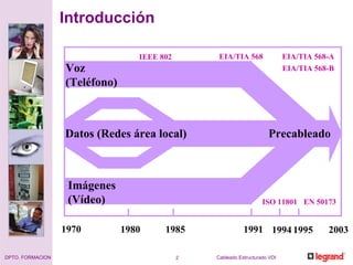 Introducción 1970 19801985 1991 1994 1995 2003 IEEE 802 ISO 11801 EN 50173 Voz (Teléfono) Datos (Redes área local) Imágenes (Vídeo) Precableado EIA/TIA 568 EIA/TIA 568-A EIA/TIA 568-B