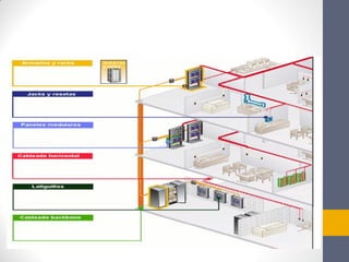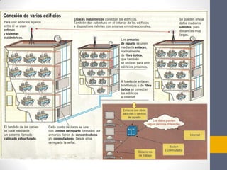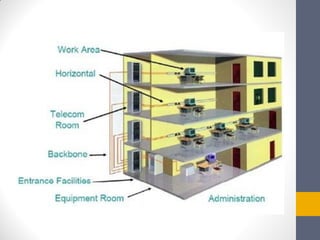 El documento resume la historia del cableado estructurado desde la aparición de la tecnología Ethernet con cable coaxial en los años 80 hasta el desarrollo de estándares como EIA/TIA568 en 1991. Describe los componentes clave de un sistema de cableado estructurado como el cableado horizontal, vertical y del backbone, así como los diferentes tipos de cables, categorías y aplicaciones.